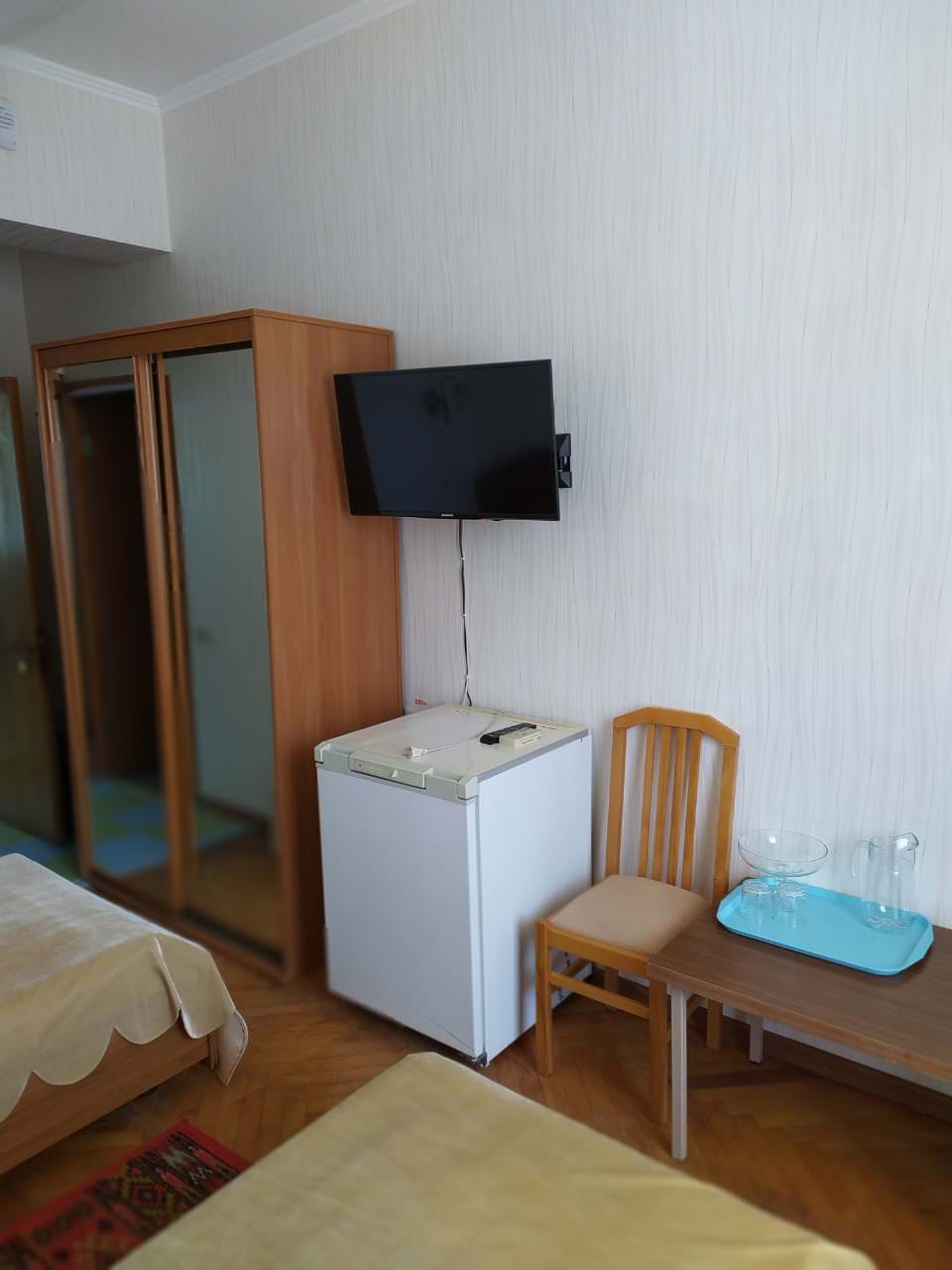 2 осн. места. 1 доп. место. Балкон. Мебель: вешалка, зеркало, кровати односпальные, прикроватные тумбочки, стол, стулья, тумба багажная, шкаф. Оборудование: кондиционер, набор посуды, телевизор, телефон, холодильник, электрочайник. Санузел: с душем, фен. Сервис: Wi-Fi бесплатно, смена полотенец, смена постельного белья, уборка номера, услуги внутренней телефонной связи.